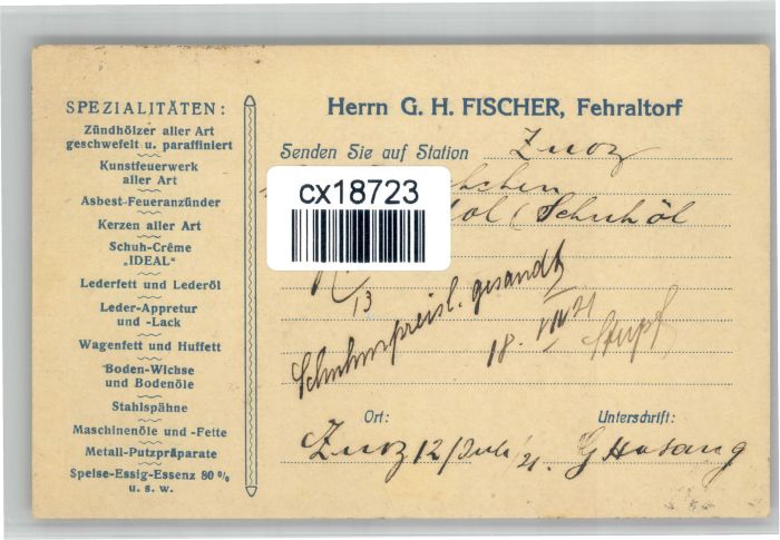 10724416 alte Postkarte Fehraltorf Herrn G H Fischer Chemische Zuend Fettwaren Fabrik postalisch gelaufen KatCode: 11470260900392