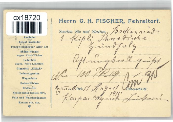 10724413 alte Postkarte Fehraltorf Herrn G H Fischer Chemische Zuend Fettwaren Fabrik postalisch gelaufen KatCode: 11470260900392