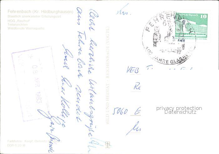 72132908 alte Postkarte Fehrenbach Thueringer Wald HOG Rasthof Waldbaude Werraquelle postalisch gelaufen Erhaltung siehe scans KatCode: 11110016069061