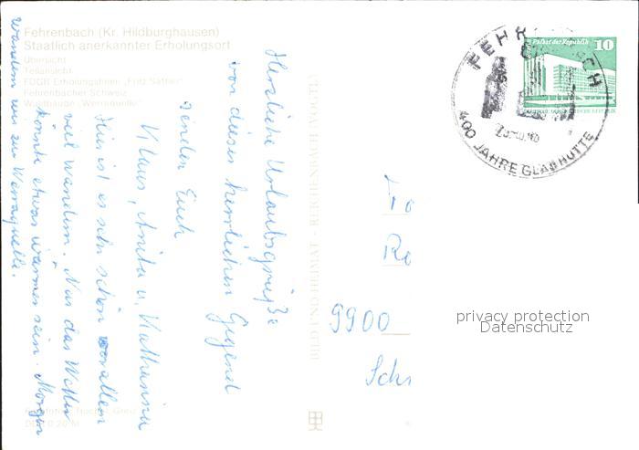 72326657 alte Postkarte Fehrenbach Thueringer Wald Panorama Teilansicht FDGB Erholungsheim Fritz Sattler Fehrenbacher Schweiz Waldbaude Werraquelle postalisch gelaufen Erhaltung siehe scans KatCode: 11110016069061