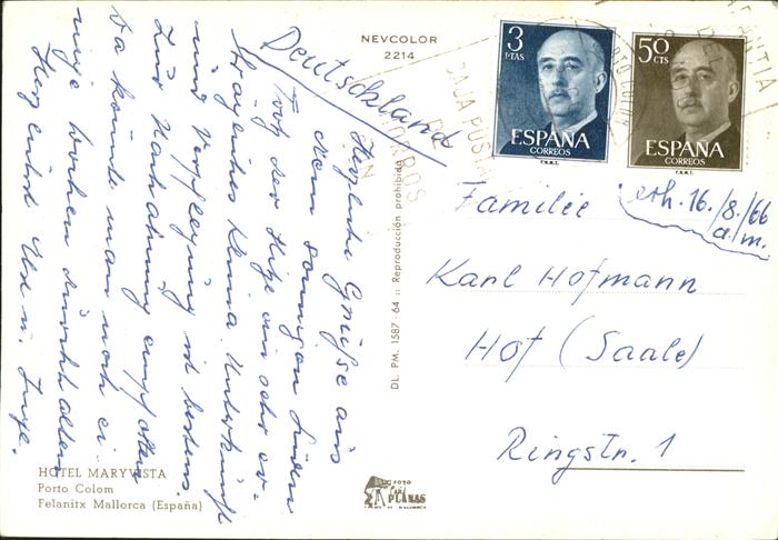 old postcard Felanitx Mallorca Islas Baleares Hotel Maryvista Porto Colom postalisch gelaufen Erhaltung siehe scans