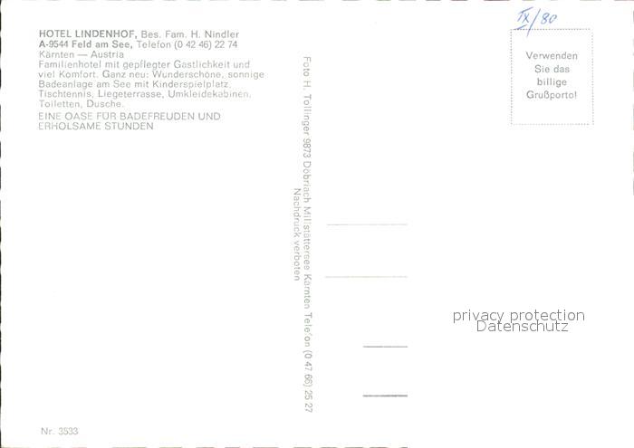 11923592 Feld See Hotel Lindenhof Liegewiese Kinderspielplatz Schlauchboote postalisch nicht gelaufen Erhaltung siehe scans KatCode: 11390211020708