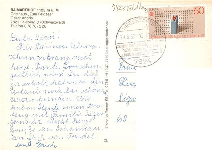 73931213 alte Postkarte Feldberg 1450m Schwarzwald Gasthaus Raimartihof am Feldsee Gaststube postalisch gelaufen Erhaltung siehe scans [WerneD78] KatCode: 11110008315037