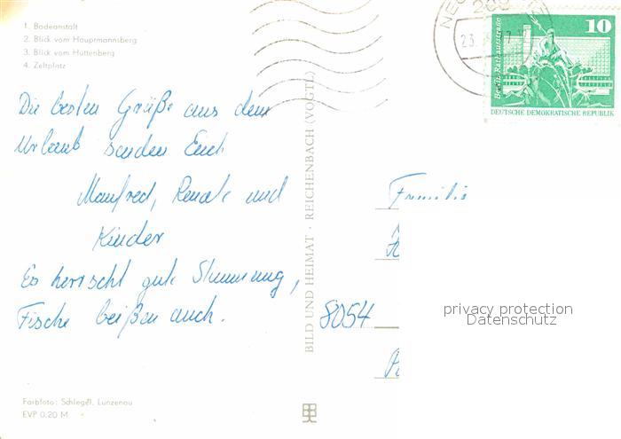 72624798 alte Postkarte Feldberg Mecklenburg Badeanstalt Blick vom Hauptmannsberg und Huettenberg Zeltplatz postalisch gelaufen Erhaltung siehe scans [WerneD78] KatCode: 11110013055082