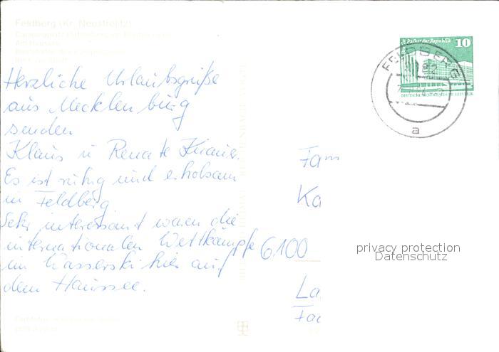 72455974 alte Postkarte Feldberg Mecklenburg Campingplatz Badestelle Kirchturm postalisch gelaufen Erhaltung siehe scans KatCode: 11110013055082