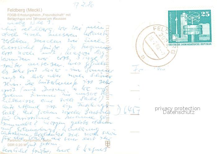 73270366 alte Postkarte Feldberg Mecklenburg Erholugsheim Freundschaft Bettenhaus Terrasse am Haussee postalisch gelaufen Erhaltung siehe scans [PaolaD17] KatCode: 11110013055082