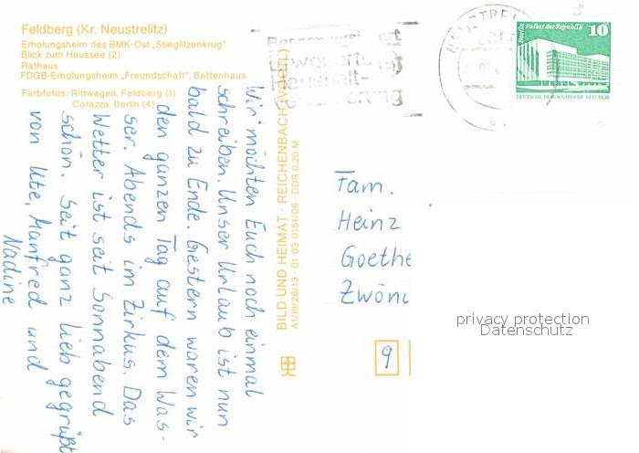 72750683 alte Postkarte Feldberg Mecklenburg Erholungsheim BMK Ost Stieglitzenkrug Haussee Rathaus postalisch gelaufen Erhaltung siehe scans [KathaD81] KatCode: 11110013055082