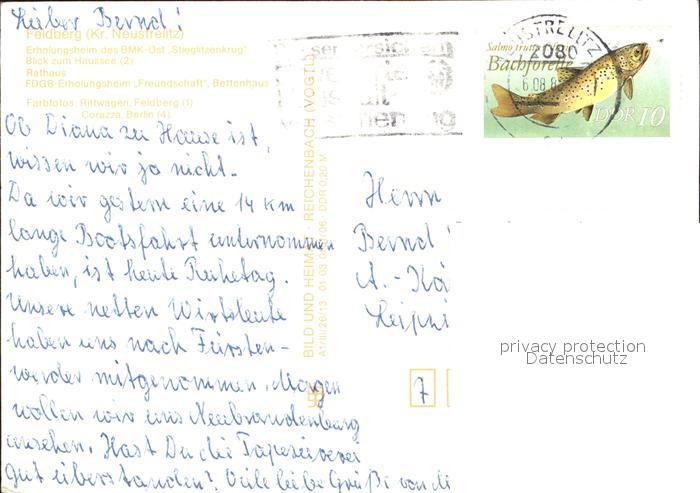 72369186 alte Postkarte Feldberg Mecklenburg Erholungsheim Stieglitzenkrug Rathaus Blick zum Haussee postalisch gelaufen Erhaltung siehe scans KatCode: 11110013055082