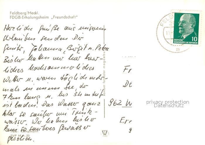 73104634 alte Postkarte Feldberg Mecklenburg FDGB Erholungsheim Freundschaft postalisch gelaufen Erhaltung siehe scans [WerneD78] KatCode: 11110013055082