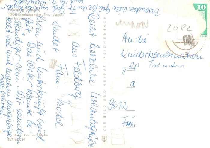 73882573 alte Postkarte Feldberg Mecklenburg FDGB Erholungsheim Freundschaft Am Haussee Terrasse Strand postalisch gelaufen Erhaltung siehe scans [WerneD78] KatCode: 11110013055082