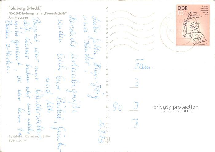 72373092 alte Postkarte Feldberg Mecklenburg FDGB Erholungsheim Freundschaft Haussee Gaststaette postalisch gelaufen Erhaltung siehe scans KatCode: 11110013055082