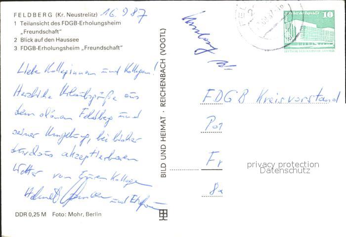 72366708 alte Postkarte Feldberg Mecklenburg FDGB Erholungsheim Freundschaft Haussee postalisch gelaufen Erhaltung siehe scans KatCode: 11110013055082