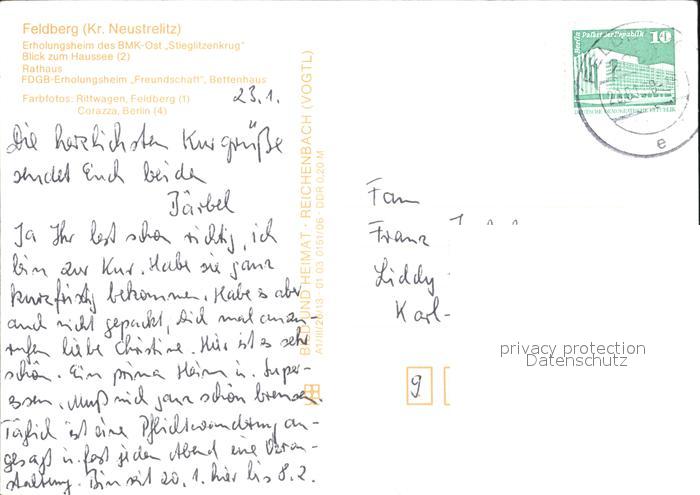72419016 alte Postkarte Feldberg Mecklenburg FDGB Ferienheim Stieglitzenkrug Haussee Rathaus FDGB Ferienheim Freundschaft postalisch gelaufen Erhaltung siehe scans KatCode: 11110013055082