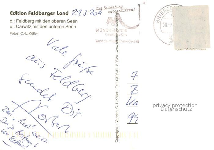 73744823 alte Postkarte Feldberg Mecklenburg Fliegeraufnahmen mit oberen Seen und Carwitz mit den unteren Seen postalisch gelaufen Erhaltung siehe scans [FriedD77] KatCode: 11110013055082