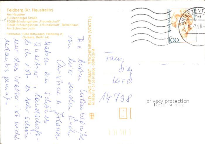 72154636 alte Postkarte Feldberg Mecklenburg Haussee Fuerstenberger Strasse FDGB Erholungsheim Schmaler Luzin postalisch gelaufen Erhaltung siehe scans KatCode: 11110013055082