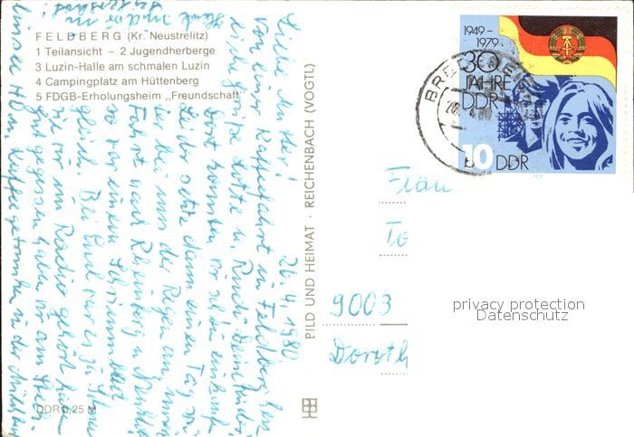 72427285 alte Postkarte Feldberg Mecklenburg Jugendherberge Luzin-Halle Camping Huettenberg postalisch gelaufen Erhaltung siehe scans KatCode: 11110013055082