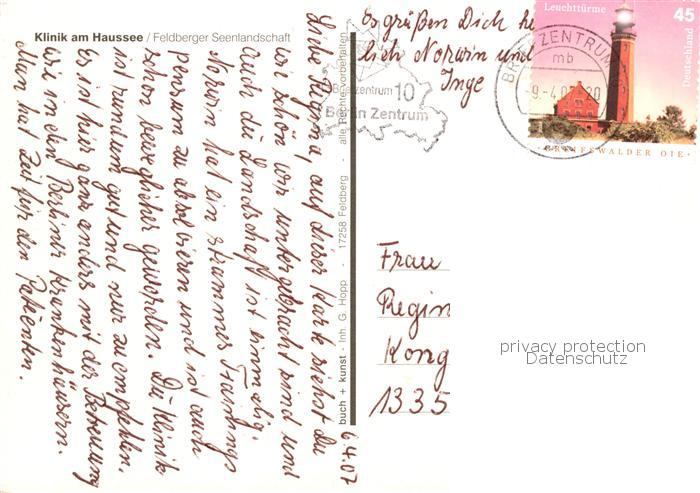 73842895 alte Postkarte Feldberg Mecklenburg Klinik am Haussee Fliegeraufnahme Panorama Seenlandschaft postalisch gelaufen Erhaltung siehe scans [FriedD77] KatCode: 11110013055082