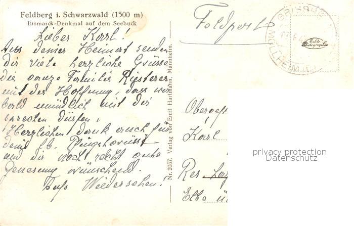 73369136 alte Postkarte Feldberg Schwarzwald Bismarck Denkmal Seebuck postalisch gelaufen Feldpost – Stempel Erhaltung siehe scans [KathaD81] KatCode: 11110008315037