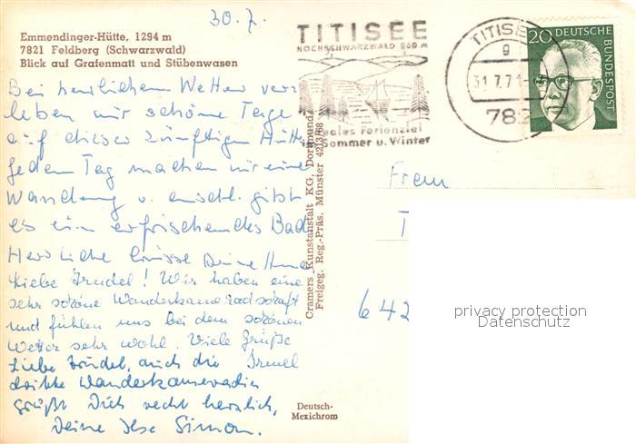 73030425 alte Postkarte Feldberg Schwarzwald Emmendinger Huette mit Grafenmatt und Stuebenwasen postalisch gelaufen Erhaltung siehe scans [WerneD78] KatCode: 11110008315037