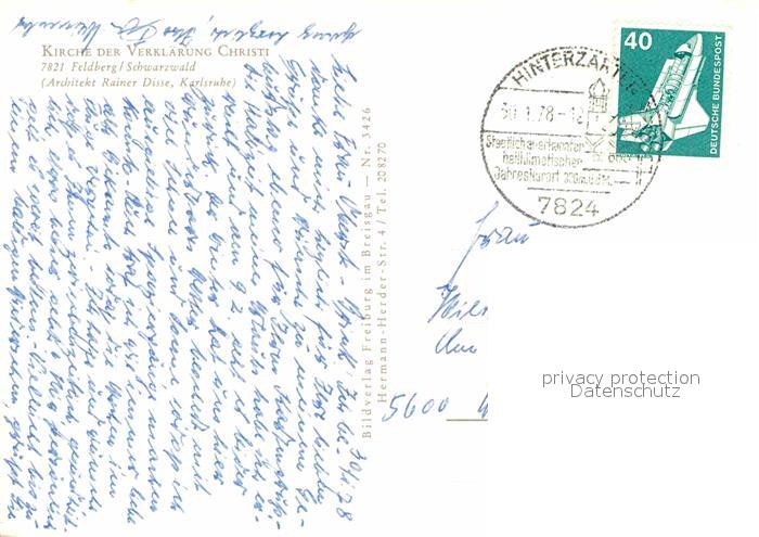 72856363 alte Postkarte Feldberg Schwarzwald Kirche der Verklaerung Christi postalisch gelaufen Erhaltung siehe scans [WerneD78] KatCode: 11110008315037