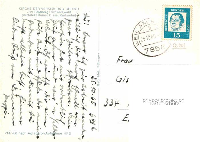 72842358 alte Postkarte Feldberg Schwarzwald Kirche der Verklaerung Christi postalisch gelaufen Erhaltung siehe scans [PaolaD17] KatCode: 11110008315037