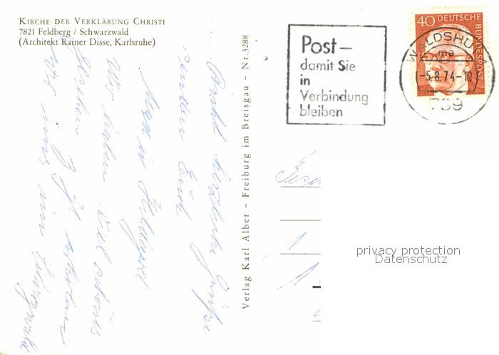 72865434 alte Postkarte Feldberg Schwarzwald Kirche der Verklaerung Christi Innenansichten Heiligenfigur Architekt Rainer Disse postalisch gelaufen Erhaltung siehe scans [FriedD77] KatCode: 11110008315037