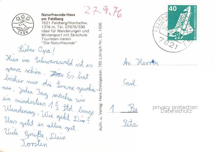 72668531 alte Postkarte Feldberg Schwarzwald Naturfreundehaus postalisch gelaufen Erhaltung siehe scans [AndreD76] KatCode: 11110008315037