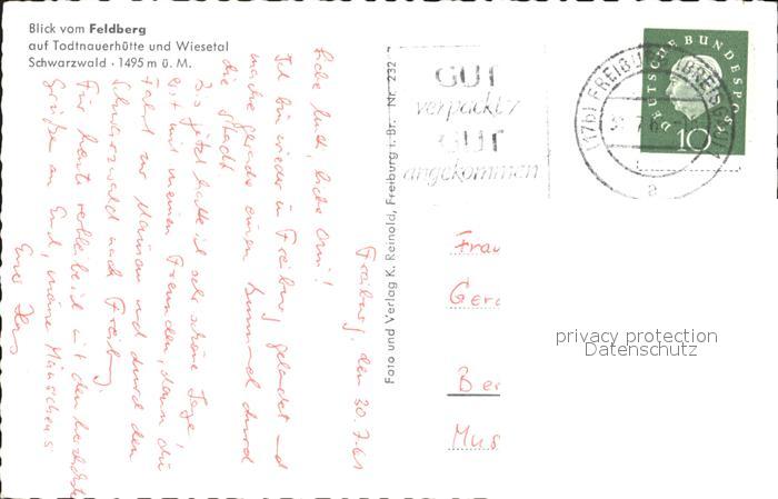 72198721 alte Postkarte Feldberg Schwarzwald Todtnauerhuette Wiesetal postalisch gelaufen Erhaltung siehe scans KatCode: 11110008315037