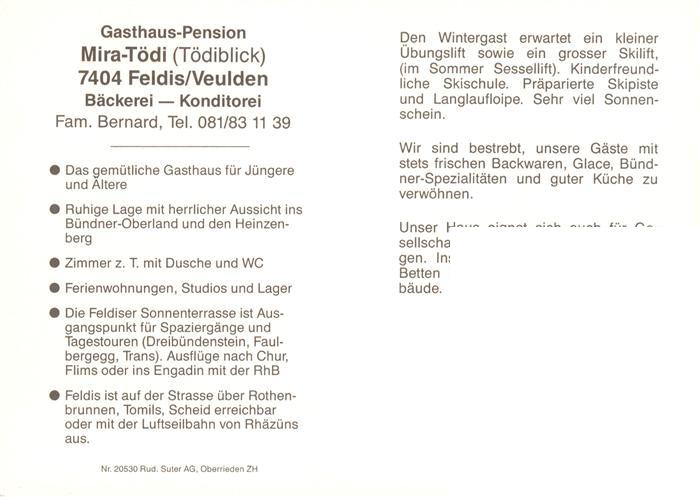 13890026 alte Postkarte Feldis GR Gasthaus Mira Toedi Gastraeume Kaminzimmer postalisch gelaufen Werbekarte (keine Postkarte) Erhaltung siehe scans [WerneD78] KatCode: 11470100315044