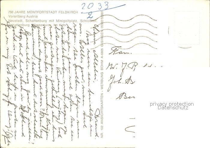 72430720 alte Postkarte Feldkirch Vorarlberg Montfortstadt Neustadt Schattenburg Minigolfplatz Schlosshof Wasserturm postalisch gelaufen Erhaltung siehe scans KatCode: 11390342080404