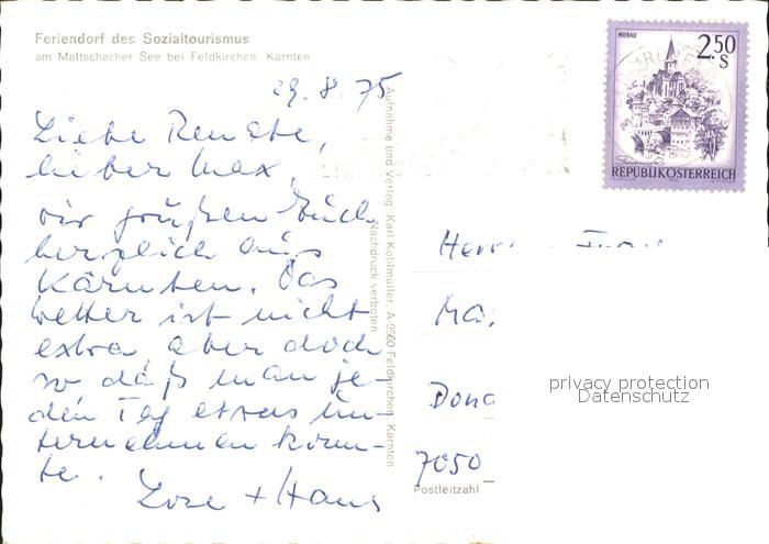 71960082 alte Postkarte Feldkirchen Kaernten Feriendorf Sozialtourismus Maltschacher See postalisch gelaufen Erhaltung siehe scans KatCode: 11390212021002