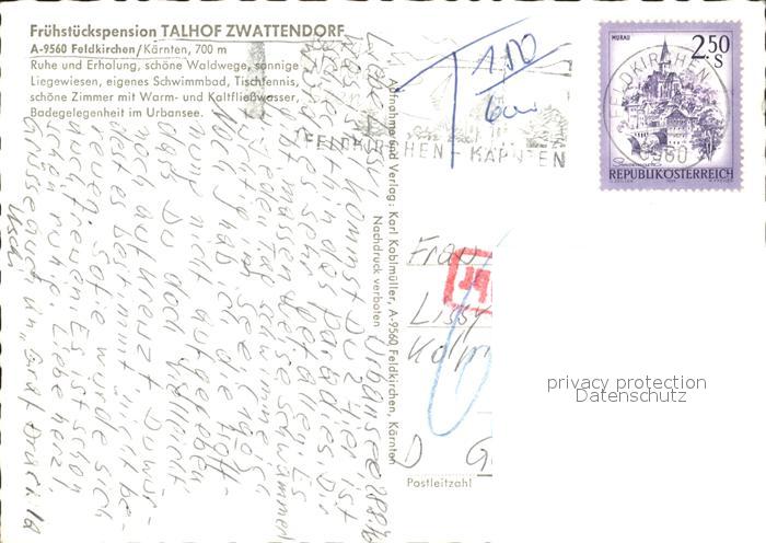 72183869 alte Postkarte Feldkirchen Kaernten Fruehstueckspension Talhof Zwattendorf Urbansee postalisch gelaufen Erhaltung siehe scans KatCode: 11390212021002