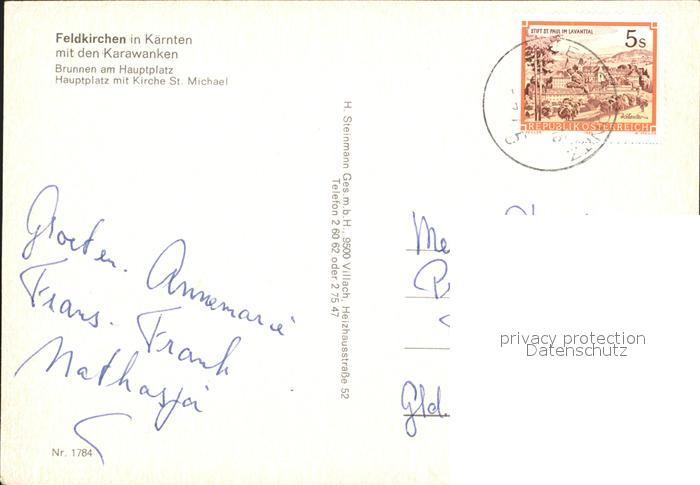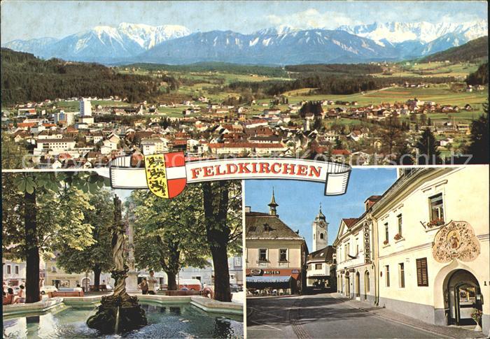72093095 alte Postkarte Feldkirchen Kaernten mit den Karawanken Brunnen am Hauptplatz Kirche St Michael postalisch gelaufen Erhaltung siehe scans KatCode: 11390212021002