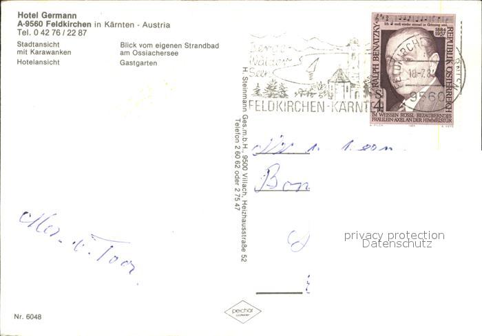 72603664 alte Postkarte Feldkirchen Kaernten Stadtbild mit Karawanken Ossiachersee Hotel Germann Garten postalisch gelaufen Erhaltung siehe scans [FriedD77] KatCode: 11390212021002