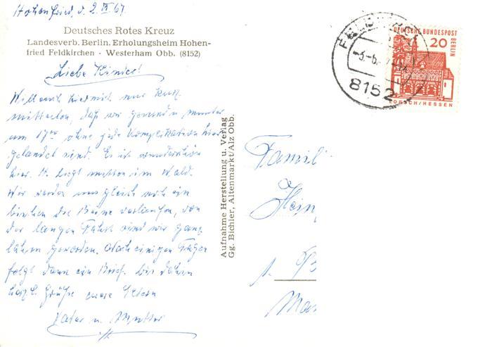 73923670 alte Postkarte Feldkirchen-Westerham DRK Erholungsheim Hohenfried postalisch gelaufen Erhaltung siehe scans [WerneD78] KatCode: 11110009187130