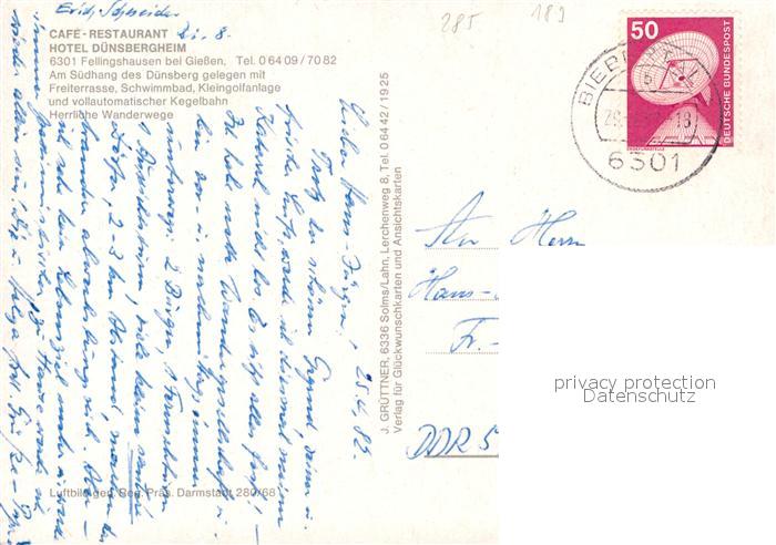 73570198 alte Postkarte Fellingshausen Hessen Cafe-Restaurant Hotel D?nsbergheim Fliegeraufnahme postalisch gelaufen Erhaltung siehe scans [PaolaD17] KatCode: 11110006531002