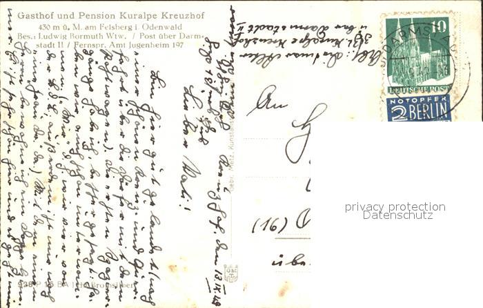 72094100 alte Postkarte Felsberg Odenwald Gasthof-Pension Kuralpe-Kreuzhof Ohly-Turm postalisch gelaufen Erhaltung siehe scans KatCode: 11110006431014