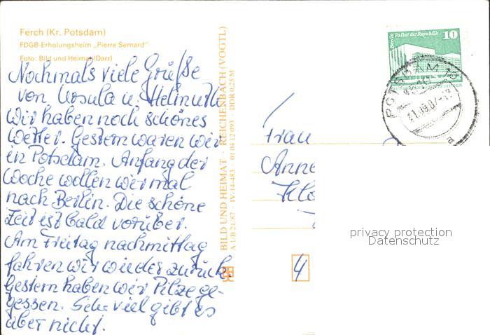 72091895 alte Postkarte Ferch FDGB Erholungsheim Pierre Semard postalisch gelaufen Erhaltung siehe scans KatCode: 11110012069590