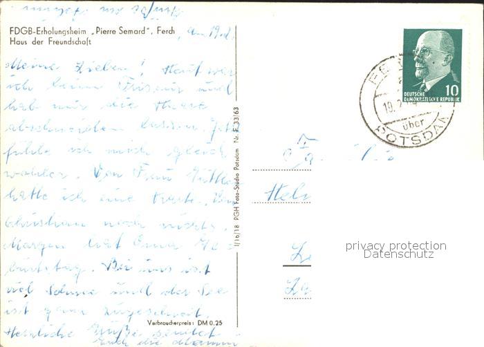 72311486 alte Postkarte Ferch FDGB- Erholungsheim Pierre Semard Haus der Freundschaft postalisch gelaufen Erhaltung siehe scans KatCode: 11110012069590