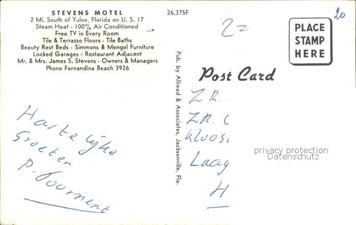 72311235 Fernandina Beach Stevens Motel postalisch nicht gelaufen Erhaltung siehe scans KatCode: 14140110000000