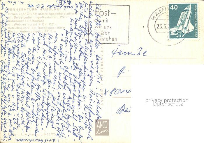 alte Postkarte Fernsehturm Funkturm Hamburg Fliegeraufnahme postalisch gelaufen Erhaltung siehe scans