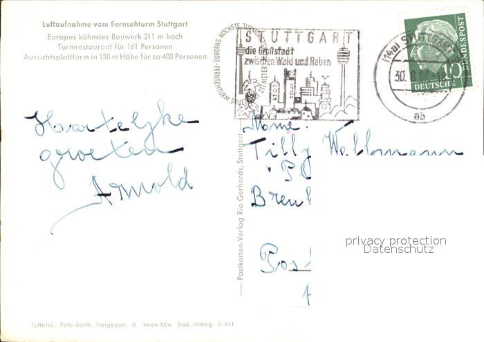 alte Postkarte Fernsehturm Funkturm Stuttgart Fliegeraufnahme postalisch gelaufen Erhaltung siehe scans