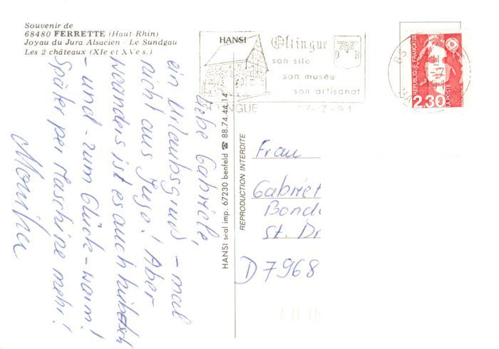 13883068 Ferrette Haut-Rhin Vue aérienne postalisch gelaufen Erhaltung siehe scans [FriedD77] carte postale Frie Katcode 11170068168090