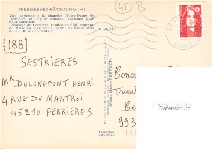 13147944 carte postale Ferrieres-en-Gatinais Fliegeraufnahme postalisch gelaufen Erhaltung siehe scans [LiesaD40] KatCode: 11170045145145
