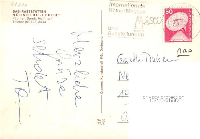 73868469 alte Postkarte Feucht Schoener Brunnen und Frauenkirche Raststaette Motel Burg Heilig Geist Spital Henkersteg postalisch gelaufen Erhaltung siehe scans [WerneD78] KatCode: 11110009574123