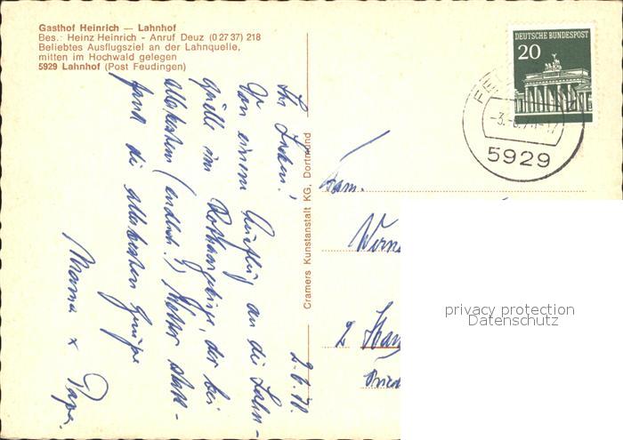 72274524 alte Postkarte Feudingen Gasthof Heinrich Lahnhof postalisch gelaufen Erhaltung siehe scans KatCode: 11110005970028
