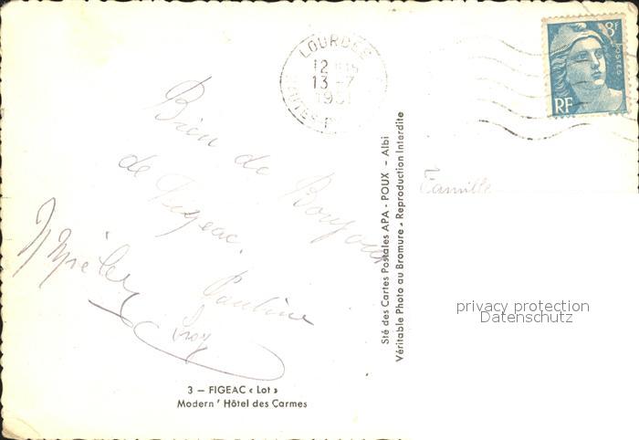 12282983 carte postale Figeac Modern Hotel des Carmes postalisch gelaufen Erhaltung siehe scans KatCode: 11170046246102