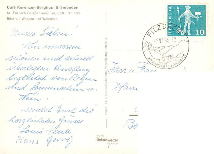 13875952 alte Postkarte Filzbach GL Cafe Kerenzer Berghus Braemboden mit Blick auf Weesen und Walensee postalisch gelaufen Erhaltung siehe scans [WerneD78] KatCode: 11470090300872