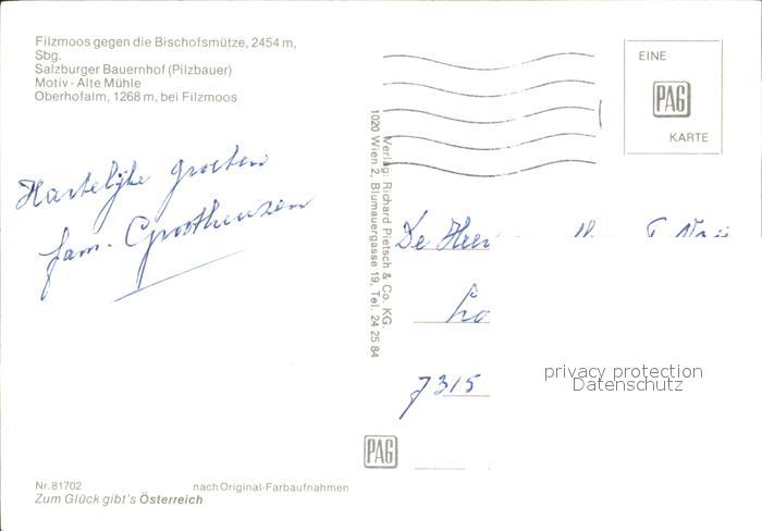 72092322 alte Postkarte Filzmoos mit Bischofsmuetze Salzburger Bauernhof Alte Muehle Oberhofalm postalisch gelaufen Erhaltung siehe scans KatCode: 11390322050407