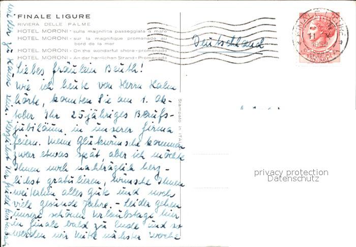 old postcard Finale Ligure Hotel Moroni Strandpromenade postalisch gelaufen Erhaltung siehe scans